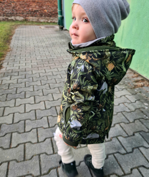 Kurtka niezniszczalna. Wodoodporny i wiatroodporny softshell - czyli wierzchnia warstwa, w przepiękny wzórSafari lub Peonie podszyty cieńszą wełną gotowaną. Nada się idealnie na okres od jesieni do wiosny. Kurtka nie jest zbyt gruba dzięki czemu zajmuje mniej miejsca w foteliku niż te puchowe.